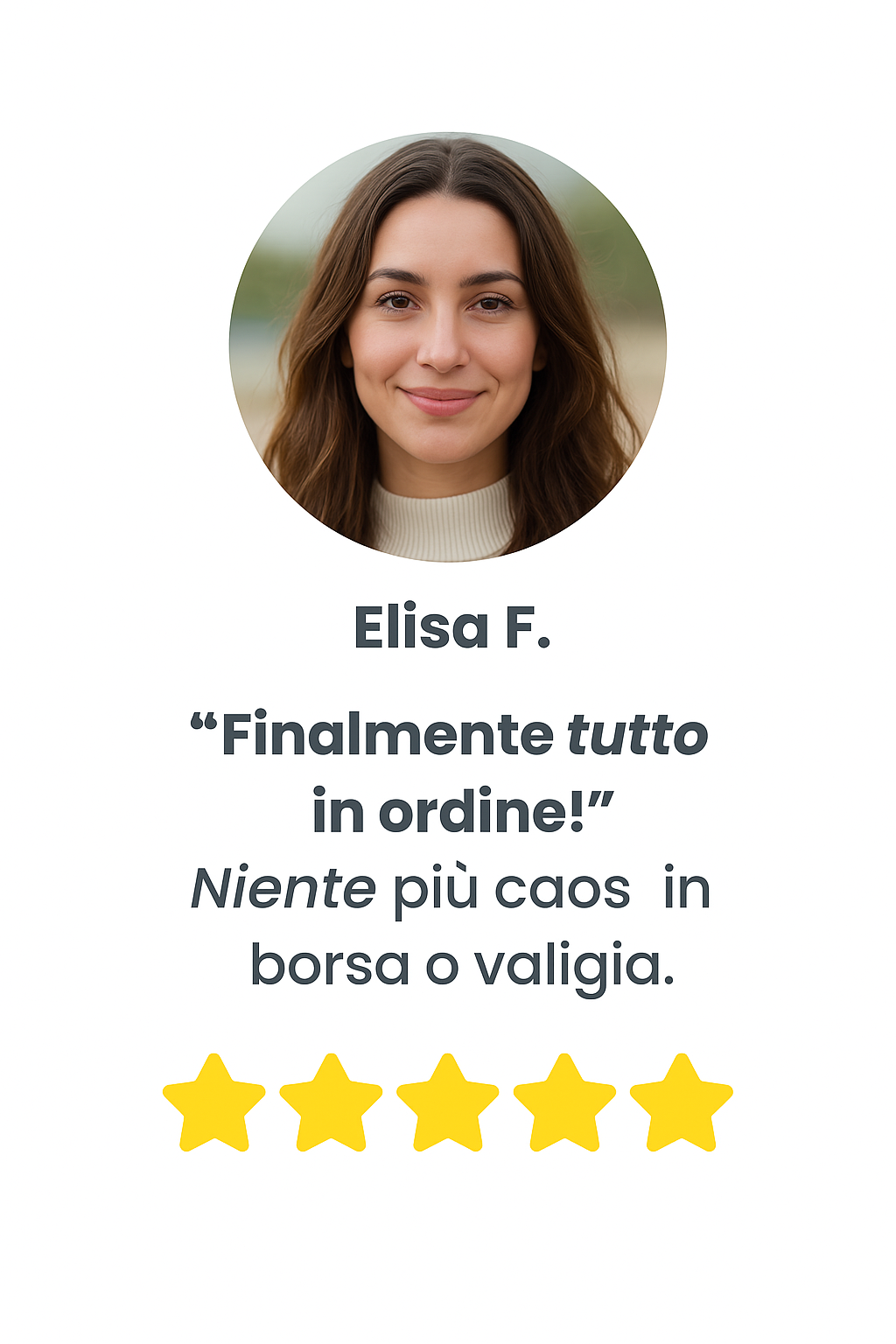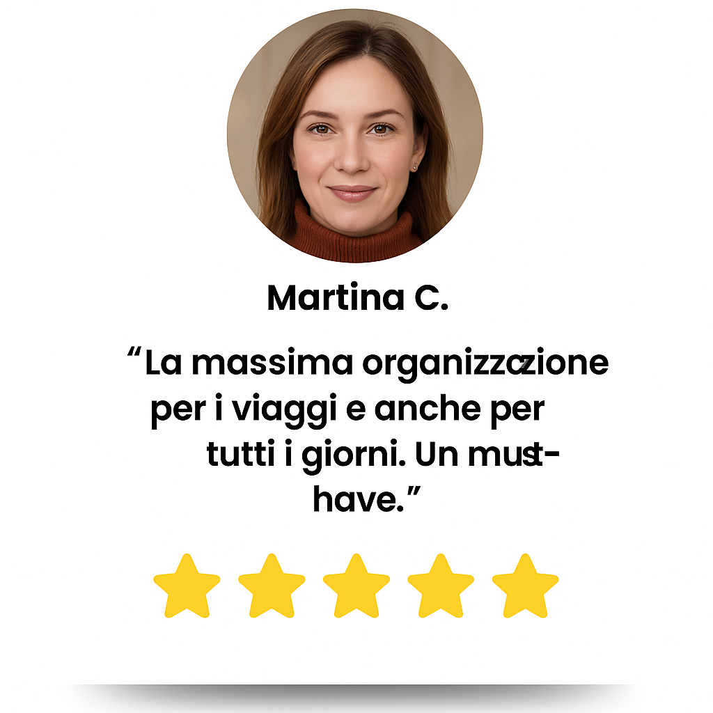 A differenza dei beauty-case rigidi o profondi dove devi “frugare”, il nostro si apre completamente come un cassetto. Ogni prodotto è visibile e accessibile in un secondo.